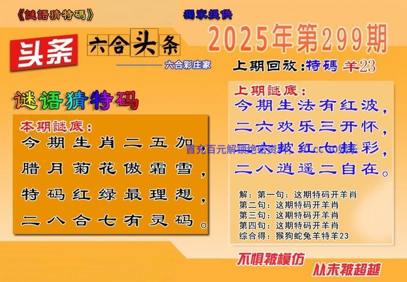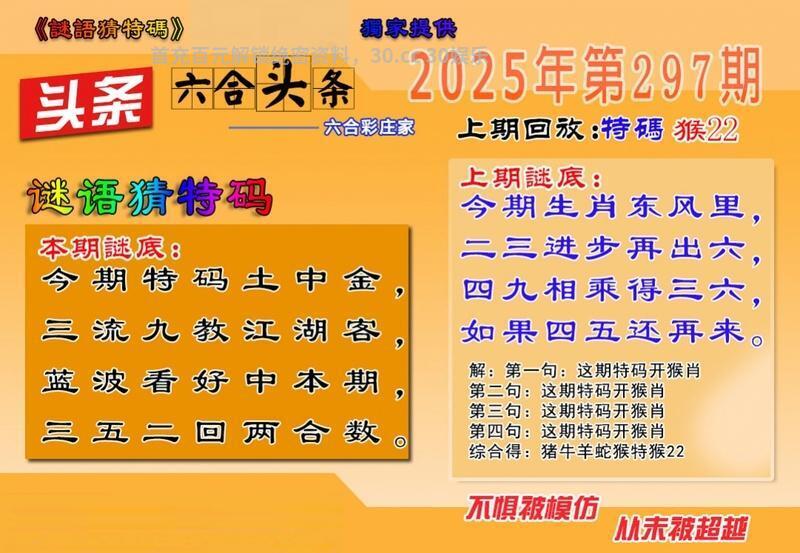 | 297期 今期特码土中金 三流九教江湖客 蓝波看好中本期 三五二回两合数 解译:今期特码土中金指土肖牛龙羊狗,金肖猴鸡,蓝波看好中本期指蓝波 九肖:牛龙羊狗猴鸡蛇马虎 六肖:牛龙羊狗猴鸡 |